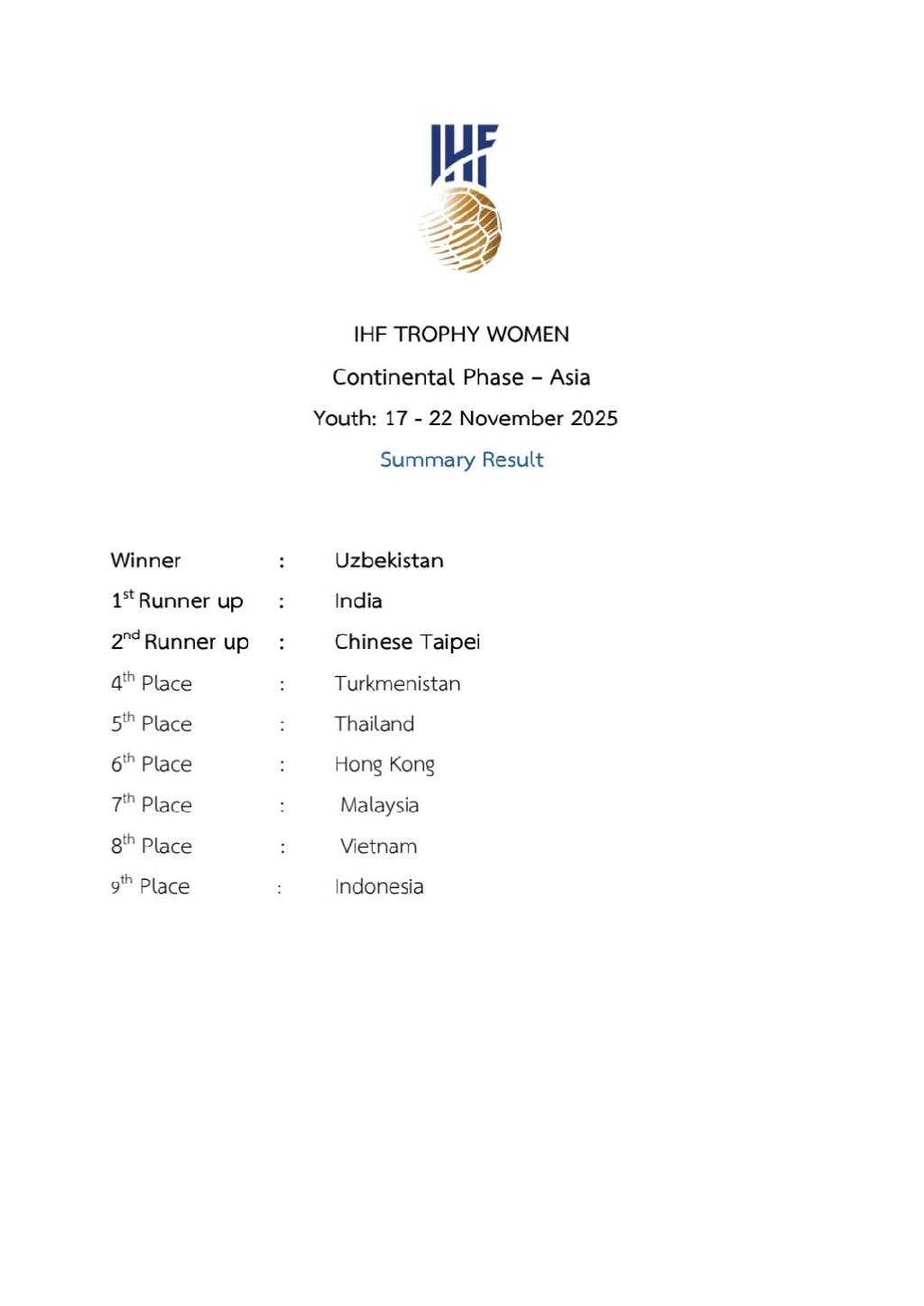 IHF TROPHY WOMEN Continental Phase-Asia Youth: 17-22 November 2025 Summary Result 01/12/2025 0 Read More